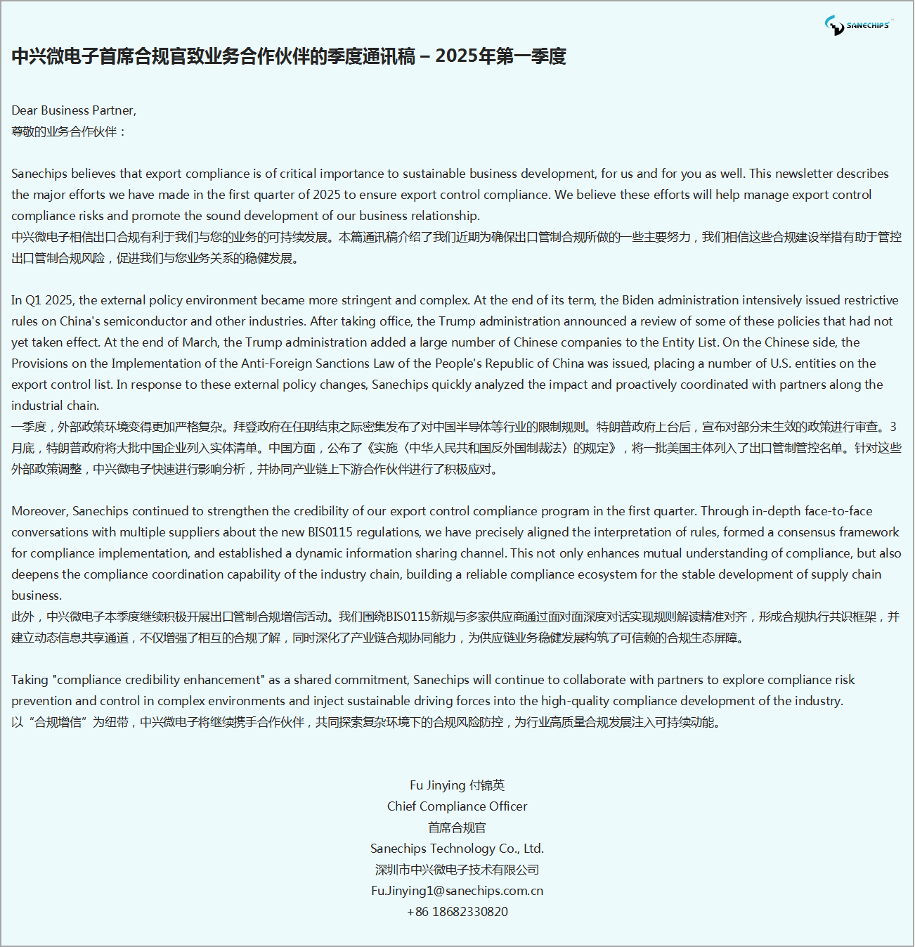 中兴微电子首席合规官致业务合作伙伴的季度通讯稿 – 2025年第一季度